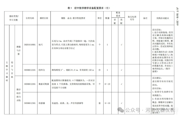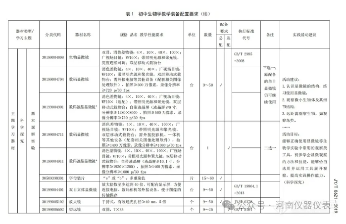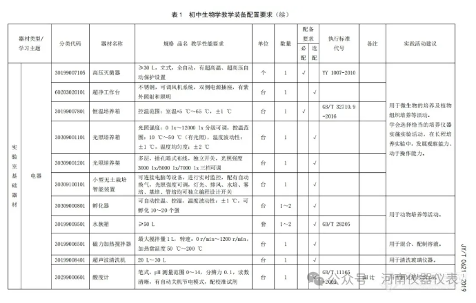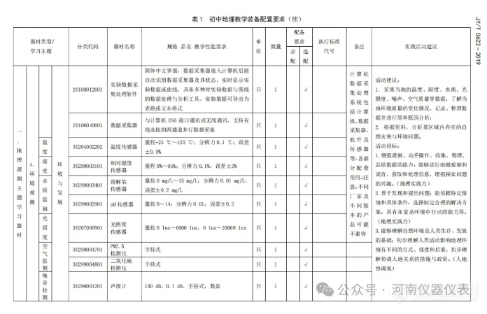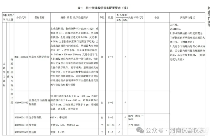 根據(jù)配置標(biāo)準(zhǔn),初中物理要求配置微型教學(xué)掃描隧道顯微鏡、光學(xué)顯微鏡、天平、各類傳感器、激光測(cè)距儀、示波器等;初中化學(xué)要求配置電動(dòng)離心機(jī)、烘干箱、電子天平、各類傳感器、溶解氧測(cè)定儀、COD測(cè)定儀、手持氣體檢測(cè)儀、土壤成分分析儀等;初中生物要求配置高壓滅菌器、超凈工作臺(tái)、恒溫培養(yǎng)箱、生物顯微鏡、各類試劑;初中地理要求配置試驗(yàn)箱、二氧化硫檢測(cè)儀、PM2.5檢測(cè)儀、水準(zhǔn)儀、激光測(cè)距儀、各類傳感器、聲級(jí)計(jì)、電子天平等;初中數(shù)學(xué)要求配置標(biāo)尺、經(jīng)緯儀、傳感器等;小學(xué)數(shù)學(xué)則要求配置托盤天平、簡(jiǎn)易天平、數(shù)字天平等儀器設(shè)備。